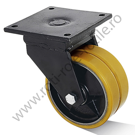 Rola pivotanta pentru sarcini mari, constructie din otel sudat, bandaj din poliuretan cu duritate de 92 Shore A